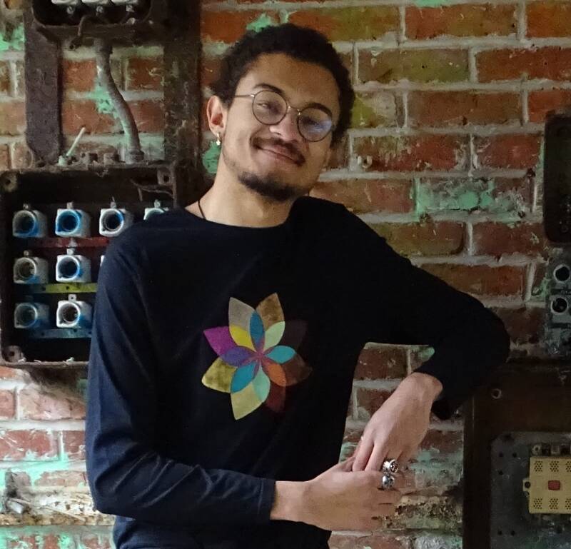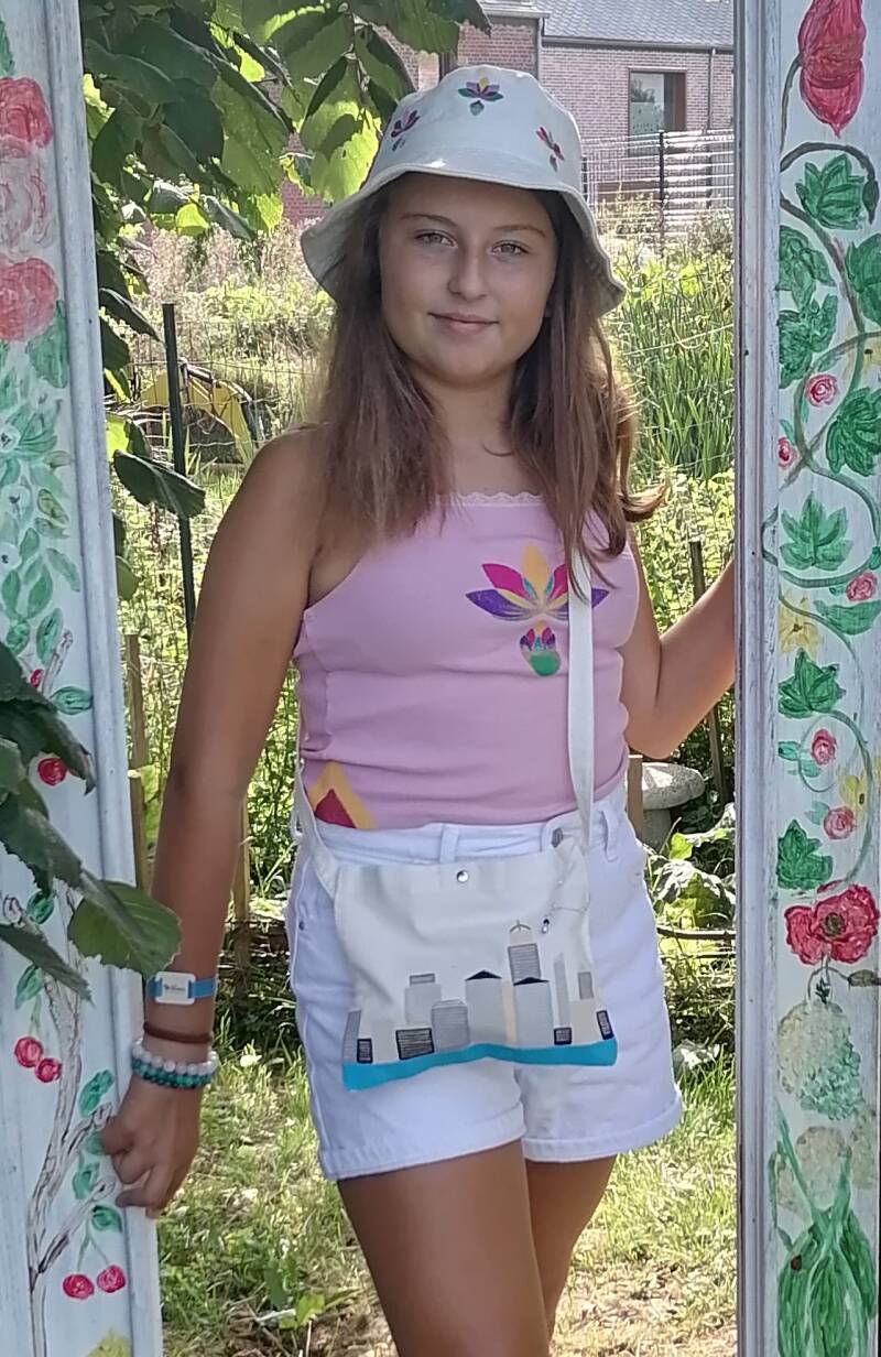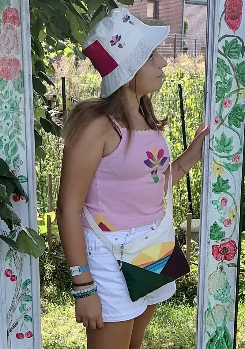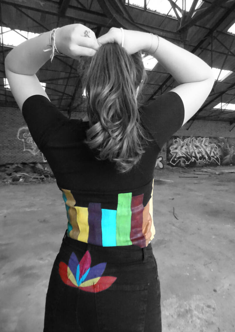 "Puis m’est venue l’idée de retravailler des extraits de mes tableaux sur des vêtements afin de toujours porter sur soi le chemin des possibles, tel un talisman"